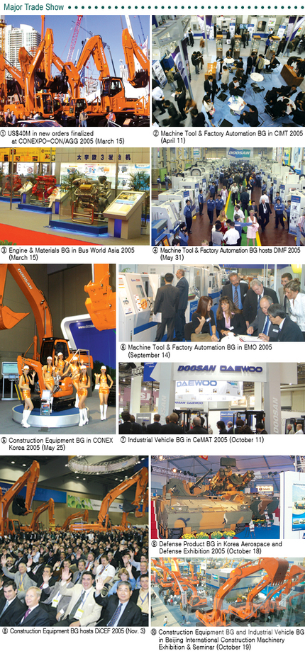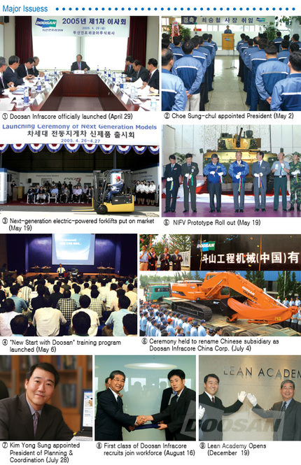 The year just past was a time of unprecedented growth and change for our company. We started out anew as Doosan Infracore in 2005. We launched new-generation products that will set new trends in global markets and we took part in many industry trade shows around the world. Here is a retrospective look at the most significant events that occurred as we continued our advance toward top-tier global status in 2005.