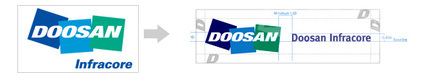 The original CI signature was placed below and partially to the right of the triple-square logo, forming a two-tiered structure. However, the new signature is positioned directly to the right of the logo, and the "Infracore" working has been extended to "Doosan Infracore."
