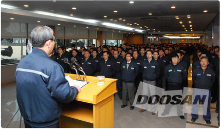 Doosan Infracore held a new year’s kick-off meeting for 2009 at the Incheon Plant and Changown Plant 1 on January 5, and made resolutions to make 2009 a profitable year for Doosan Infracore, despite the global economic recession.