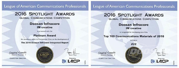 The 2015 Doosan Infracore Integrated Report awarded the Platinum Prize, the highest level in print-based communications, at the US LACP 2016 Spotlight Awards